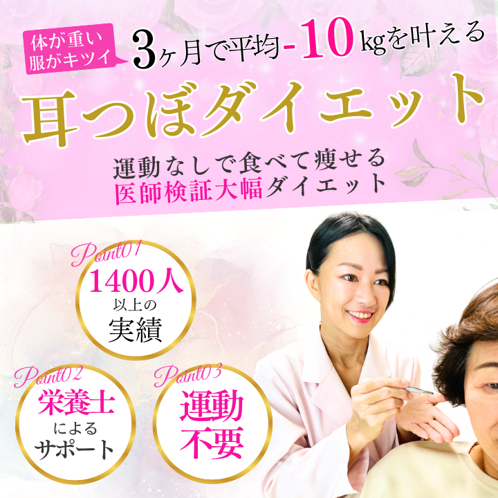 耳つぼ刺激(食欲・ストレス・ホルモン・代謝にアプローチ)と栄養士の食事サポートで身体の内側から整えることができるため、リバウンドしにくく、